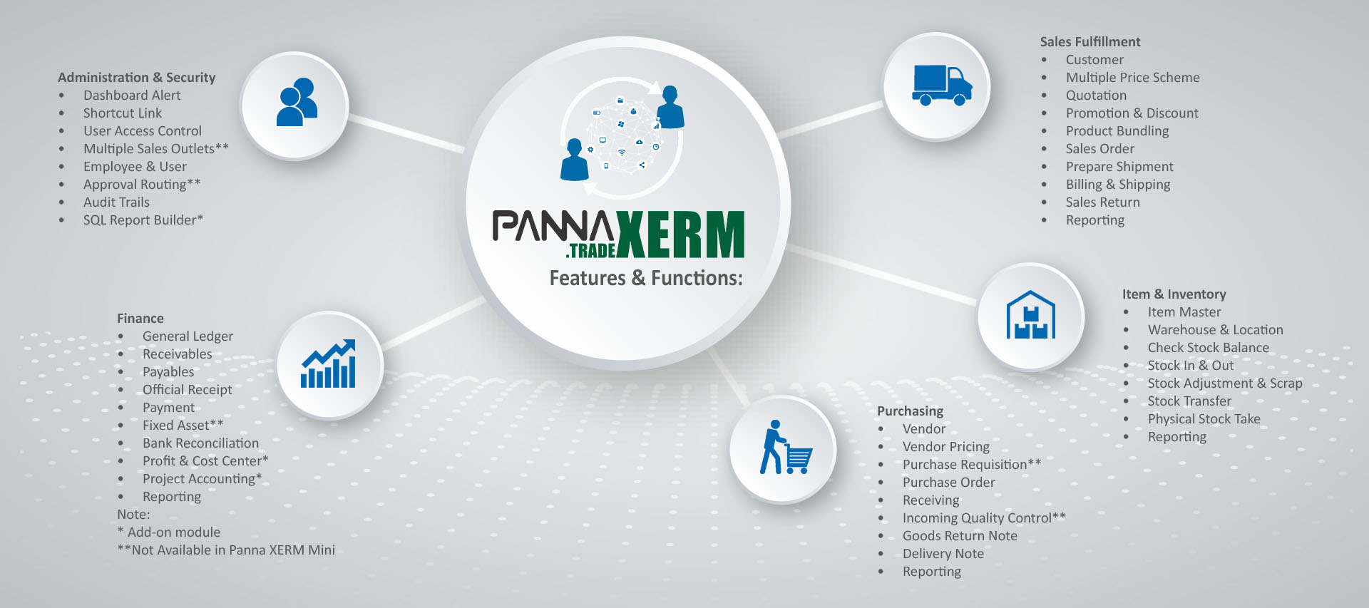 The common challenges in the trading industry, such as inventory movement, credit control, order fulfillment, and demand forecasting, can significantly impact customer satisfaction and cash flow. In this fast-changing and highly competitive environment, businesses need to respond quickly and accurately to customer and market demands. Real-time visibility into your sales, inventory, and finance status is crucial to support your business decisions and keep your business competitive. Panna XERM.trade, an ERP for trading business, is the solution that can help you address these critical business needs, creating a continuous growth trajectory and boosting profitability. Panna XERM.trade is an optimum solution for sales distribution, empowering all key areas of your trading operations, from Sales Fulfillment, Promotion, Purchasing, Warehouse & Inventory to Financial Accounting. With this solution, you can experience measurable improvements by lowering costs and increasing service levels and productivity, ultimately leading to higher profit margins! We also offer Panna XERM.mini, an entry-level ERP package targeted at small to medium enterprises or industries (small in terms of company headcount, not in terms of business size) to manage their back office with less hassle. Whether you're looking for a full-fledged ERP for trading business or an affordable entry-level solution, Panna XERM provides options to suit your needs.
